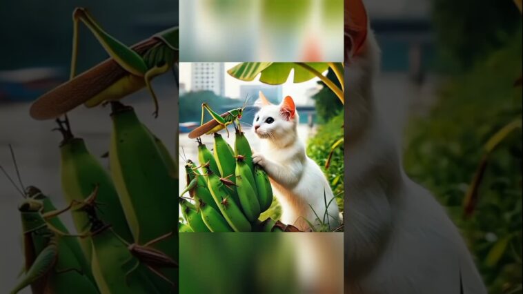 A cat is catching a grasshopper and eating it #cat #ai #aicat #funny #whitecat #cute #cutecat #catlover #grasshopper.