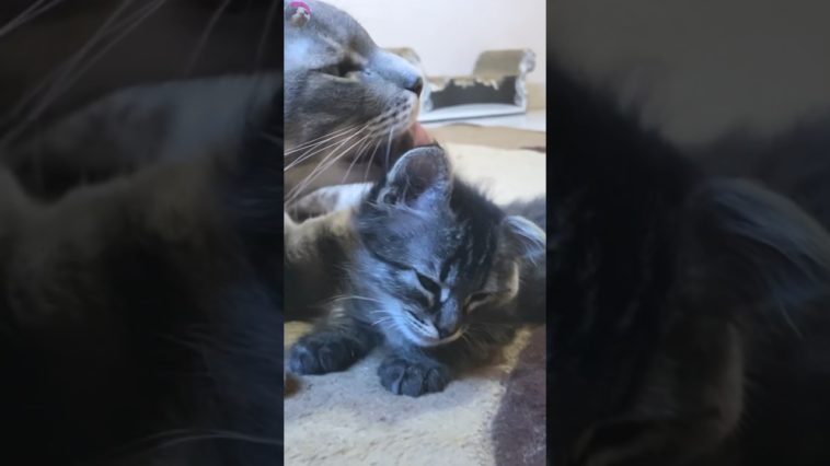 A rescued kitten falls asleep while being adored by a big cat #shorts