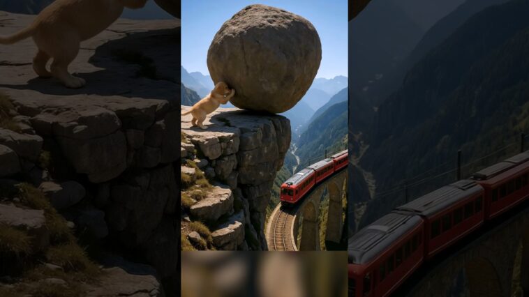 A runaway mountain train races around a cliffside bridge toward a tiny orange kitten frozen on the tracks… until a brave golden …