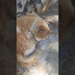 mignon chat errant orange et blanc se lèche en douceur. stray orange cat licks.