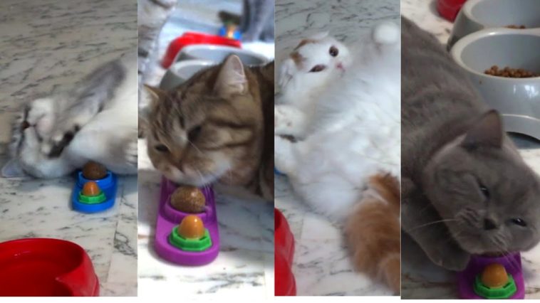 Nos chats découvrent les boules d’herbe à chat (race Scottish Straight et Fold)